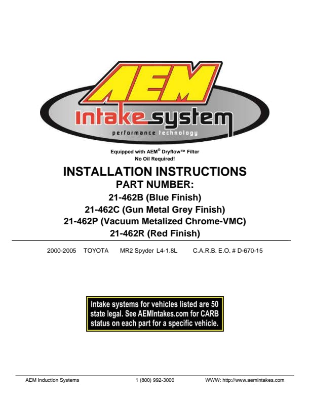 The AEM 21-462B Performance Cold Air Intake System produces horsepower and torque gains by replacing your vehicle's restrictive factory air filter and air intake housing. This air intake system was designed, tuned and dyno-tested to fit specific Toyota MR2 Spyder models. Air enters the system through an oversized AEM Dryflow synthetic washable air filter for outstanding air flow, filtration and performance. The air filter is relocated to the driver-side wheel well which is designed to reduce intake air temperature and increase horsepower. The intake tubing is constructed from mandrel-bent aluminum featuring a durable blue powder coated finish. This air intake system was developed to accommodate the engine's factory emissions control devices including the mass air flow sensor and vacuum switching valves. The tapered cylinder shaped AEM Dryflow air filter is made from an oil-free, synthetic filter media that can be used for up to 100,000 miles before cleaning is needed (depending on driving conditions).