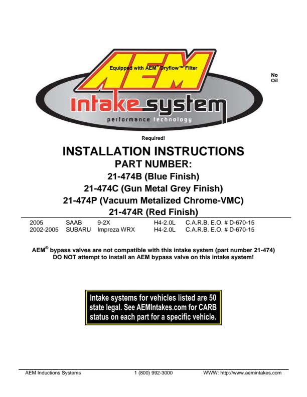 The AEM 21-474P Performance Cold Air Intake System produces horsepower and torque gains by replacing your vehicle's restrictive factory air filter and air intake housing. This air intake system was designed, tuned and dyno-tested to fit specific Subaru Impreza WRX and Saab 9-2X models. Air enters the system through an oversized AEM Dryflow synthetic washable air filter for outstanding air flow, filtration and performance. The air filter is relocated to the passenger-side wheel well which is designed to reduce intake air temperature and increase horsepower. The intake tubing is constructed from mandrel-bent aluminum featuring a durable chrome-like finish. This air intake system was developed to accommodate the engine's factory emissions control devices including the mass air flow sensor. The tapered cylinder shaped AEM Dryflow air filter is made from an oil-free, synthetic filter media that can be used for up to 100,000 miles before cleaning is needed (depending on driving conditions).