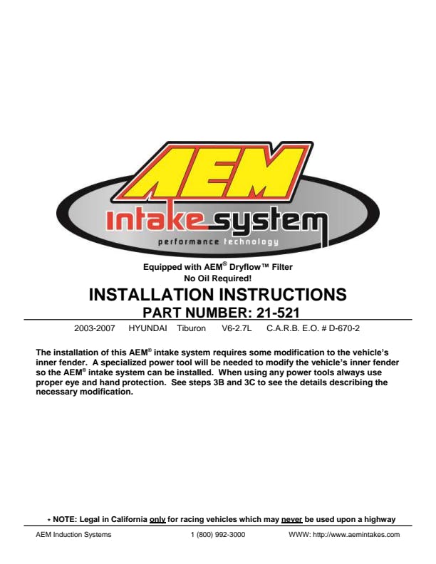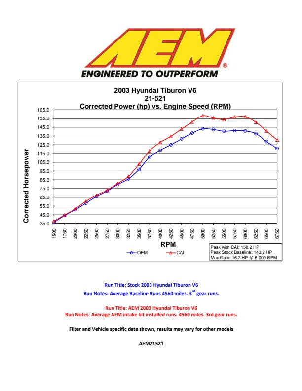 The AEM 21-521C Performance Cold Air Intake System produces horsepower and torque gains by replacing your vehicle's restrictive factory air filter and air intake housing. This air intake system was designed, tuned and dyno-tested to fit specific Hyundai Tiberon models. Air enters the system through an oversized AEM Dryflow synthetic washable air filter for outstanding air flow, filtration and performance. The air filter is relocated to the driver-side wheel well which is designed to reduce intake air temperature and increase horsepower. The intake tubing is constructed from mandrel-bent aluminum featuring a durable gunmetal gray powder coated finish. This air intake system was developed to accommodate the engine's factory emissions control devices including the mass air flow sensor and breather hose. The tapered cylinder shaped AEM Dryflow air filter is made from an oil-free, synthetic filter media that can be used for up to 100,000 miles before cleaning is needed (depending on driving conditions).