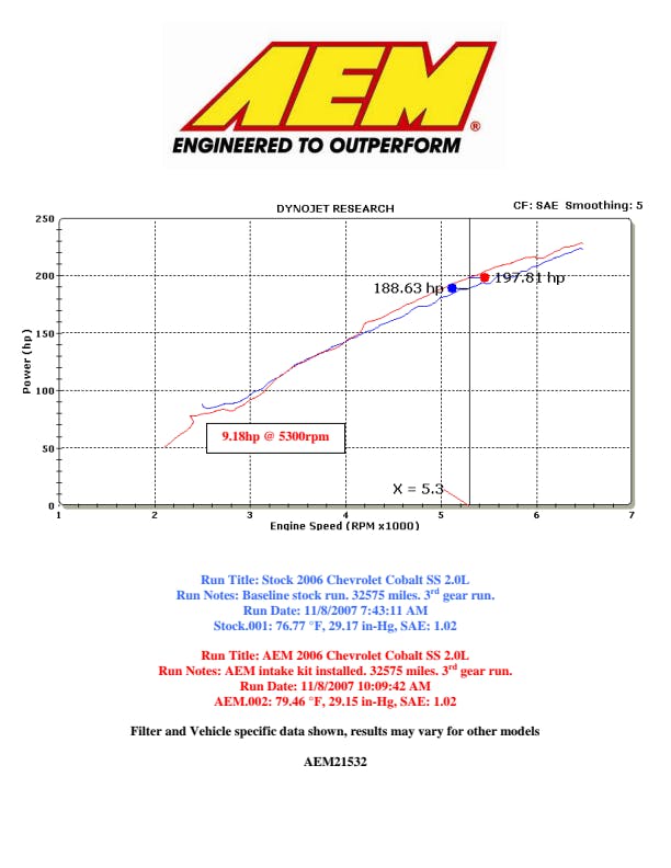 The AEM 21-532P Performance Cold Air Intake System produces horsepower and torque gains by replacing your vehicle's restrictive factory air filter and air intake housing. This air intake system was designed, tuned and dyno-tested to fit specific Chevrolet Cobalt models. Air enters the system through an oversized AEM Dryflow synthetic washable air filter for outstanding air flow, filtration and performance. The air filter is relocated to the driver-side wheel well which is designed to reduce intake air temperature and increase horsepower. The intake tubing is constructed from mandrel-bent aluminum featuring a durable mirror-polished powder coated finish. This air intake system was developed to accommodate the engine's factory emissions control devices including the mass air flow sensor. The tapered cylinder shaped AEM Dryflow air filter is made from an oil-free, synthetic filter media that can be used for up to 100,000 miles before cleaning is needed (depending on driving conditions).