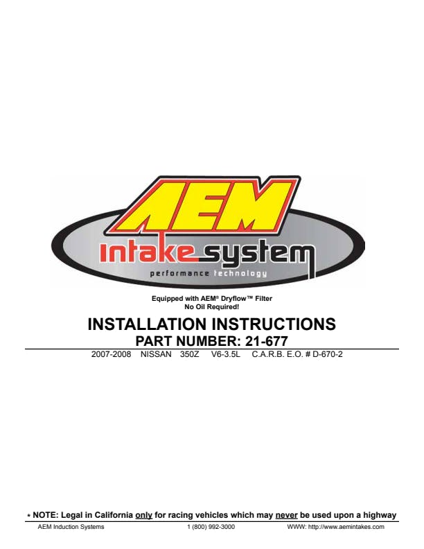 The AEM 21-677C Performance Cold Air Intake System produces horsepower and torque gains by replacing your vehicle's restrictive factory air filters and air intake housings. This air intake system was designed, tuned and dyno-tested to fit specific Nissan 350Z models. Air enters the system through dual oversized AEM Dryflow synthetic washable air filters for outstanding air flow, filtration and performance. The air filters are located in the original air box spaces and are protected by heat shields which are designed to reduce intake air temperature and increase horsepower. The intake tubes are constructed from mandrel-bent aluminum featuring a durable gunmetal gray powder coated finish. This air intake system was developed to accommodate the engine's factory emissions control devices including the mass air flow sensors and crankcase vent tube. The dual tapered cylinder shaped AEM Dryflow air filters are made from an oil-free, synthetic filter media that can be used for up to 100,000 miles before cleaning is needed (depending on driving conditions).