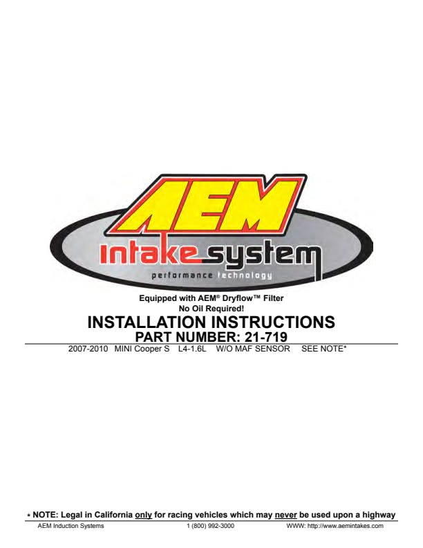 The AEM 21-719C Performance Cold Air Intake System produces horsepower and torque gains by replacing your vehicle's restrictive factory air filter and air intake housing. This air intake system was designed, tuned and dyno-tested to fit specific Mini Cooper S and S Clubman models. Air enters the system through an oversized AEM Dryflow synthetic washable air filter for outstanding air flow, filtration and performance. The air filter is located in a replacement AEM air box with a logo embossed aluminum lid and cold air hood scoop which is designed to reduce intake air temperature and increase horsepower. The intake tubing is constructed from mandrel-bent aluminum featuring a durable gunmetal gray powder coated finish. This air intake system was developed to accommodate the engine's factory emissions control devices including the crank case breather hose as well as the turbocharger inlet. The tapered cylinder shaped AEM Dryflow air filter is made from an oil-free, synthetic filter media that can be used for up to 100,000 miles before cleaning is needed (depending on driving conditions).