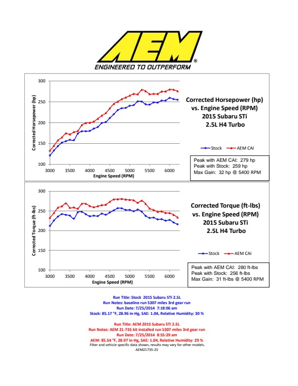 AEM Cold Air Intake Systems are designed to produce horsepower and torque gains. They replace the restrictive factory airbox and air filter to give you better performance and better engine sound. AEM cold air intakes relocate the air filter outside the engine compartment so cooler air can be fed into your engine. Cooler air carries more oxygen, which translates into a more intense explosion in the combustion chamber for more horsepower and torque. AEM Cold Air Intakes include an oversized AEM Dryflow synthetic washable air filter for outstanding air flow, filtration, and performance while allowing easy oil-free cleaning. They include a mandrel-bent aluminum intake tube and high quality hardware designed to reduce restriction and reduce intake temperature. The design and components of each intake system vary so consult the installation instructions for more information on the contents of each part number.