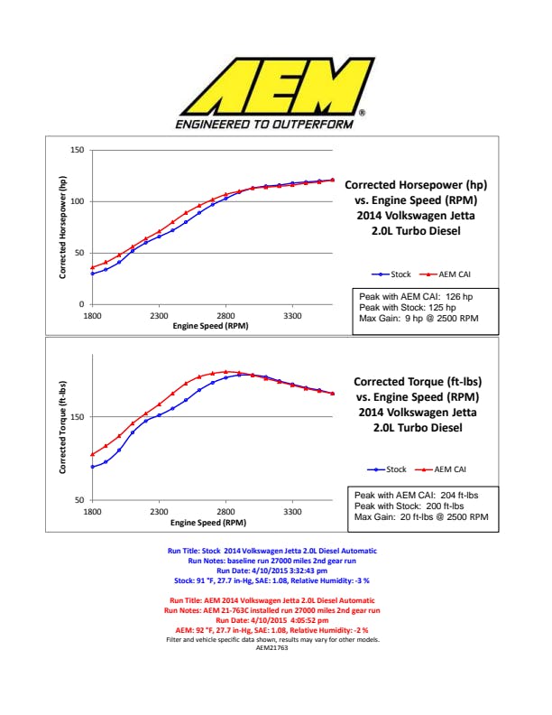 The AEM 21-763C Performance Cold Air Intake System produces horsepower and torque gains by replacing your vehicle's restrictive factory air filter and air intake housing. This air intake system was designed, tuned and dyno-tested to fit specific Volkswagen Jetta models. Air enters the system through an oversized AEM Dryflow synthetic washable air filter for outstanding air flow, filtration and performance. The air filter is located in the original air box location and is protected by a heat shield which is designed to reduce intake air temperature and increase horsepower. The intake tubing is constructed from mandrel-bent aluminum featuring a durable gunmetal gray powder coated finish. This air intake system was developed to accommodate the engine's factory emissions control devices including the mass air flow sensor and vacuum line. The tapered cylinder shaped AEM Dryflow air filter is made from an oil-free, synthetic filter media that can be used for up to 100,000 miles before cleaning is needed (depending on driving conditions). The air intake system is easy to install with commonly available tools.