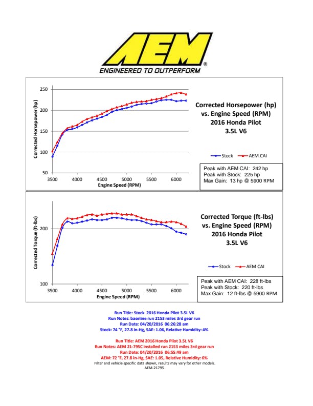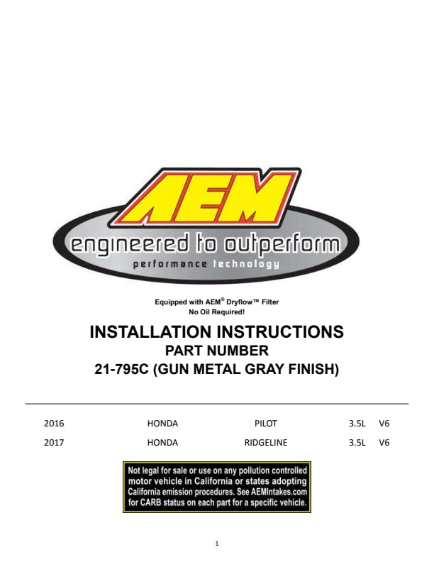 The AEM 21-795C Performance Cold Air Intake System produces horsepower and torque gains by replacing your vehicle's restrictive factory air filter and air intake housing. This air intake system was designed, tuned and dyno-tested to fit specific Honda Pilot and Ridgeline models. Air enters the system through an oversized AEM Dryflow synthetic washable air filter for outstanding air flow, filtration and performance. The air filter is placed into the original air box location and is protected by a heat shield which is designed to reduce intake air temperature and increase horsepower. The air intake tube is constructed from mandrel-bent aluminum featuring a durable gunmetal gray powder coated finish. This air intake system was developed to accommodate the engine's factory emissions control devices including the mass air flow sensor and vent tube. The tapered cylinder shaped AEM Dryflow air filter is made from an oil-free, synthetic filter media that can be used for up to 100,000 miles before cleaning is needed (depending on driving conditions). The air intake system is easy to install with commonly available tools.