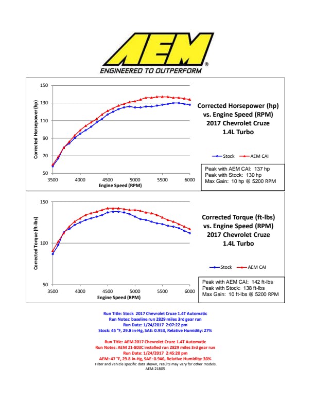 AEM Performance Cold Air Intake Systems produce horsepower and torque gains by replacing your vehicle's restrictive factory air filter and air intake housing. This air intake system was designed, tuned and dyno-tested to fit specific Chevrolet Cruze models. Air enters the system through an oversized AEM Dryflow synthetic washable air filter for outstanding air flow, filtration and performance. The air filter is located in the original air box space and is protected by a heat shield which is designed to reduce intake air temperature and increase horsepower. The air intake tubing is constructed from mandrel-bent aluminum featuring a durable gunmetal gray powder coated finish. This air intake system was developed to accommodate the engine's factory emissions control devices including the mass air sensor. The tapered cylinder shaped AEM Dryflow air filter is made from an oil-free, synthetic filter media that can be used for up to 100,000 miles before cleaning is needed (depending on driving conditions). This air intake system is easy to install with commonly available tools.