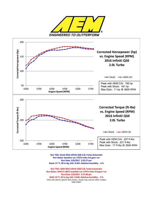 The AEM 21-807C is designed to replace the restrictive air filter and airbox of specific Infiniti Q50 models. The oversized oval-shaped AEM Dry Flow filter is made from an oil-free, synthetic filter media and can be used for up to 100,000 miles before cleaning is needed (depending on driving conditions). The AEM heatshield replaces the restrictive factory airbox, and uses the factory engine cover as it's top cover. To create a seal between the AEM heatshield/airbox and engine cover a rubber edge trim is included.