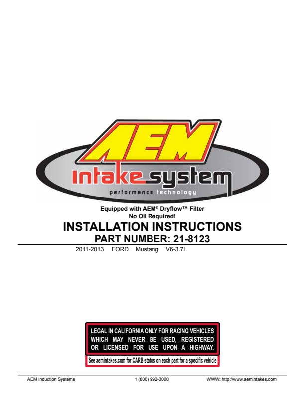 The AEM 21-8123DC Performance Cold Air Intake System produces horsepower and torque gains by replacing your vehicle's restrictive factory air filter and air intake housing. This air intake system was designed, tuned and dyno-tested to fit specific Ford Mustang models. Air enters the system through an oversized AEM Dryflow synthetic washable air filter for outstanding air flow, filtration and performance. The air filter is located in the original air box space and is protected by a replacement AEM airbox with a logo embossed aluminum lid which is designed to reduce intake air temperature and increase horsepower. The intake tubing is constructed from mandrel-bent aluminum featuring a durable gunmetal gray powder coated finish. This air intake system was developed to accommodate the engine's factory emissions control devices including the mass air flow sensor, crankcase vent hose, brake booster line. The oval cone shaped AEM Dryflow air filter is made from an oil-free, synthetic filter media that can be used for up to 100,000 miles before cleaning is needed (depending on driving conditions). The air intake system is easy to install with commonly available tools.