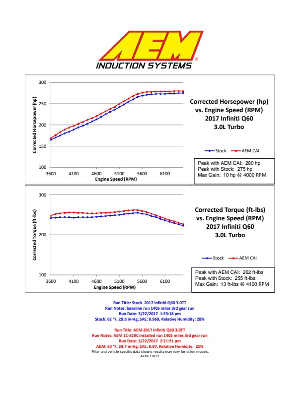 The AEM 21-819 Performance Cold Air Intake System replaces both the left and right side housings. This air intake was designed to fit some Infinity Q50 and Q60 models. Both banks uses an oval shaped AEM Dryflow Air Filter. The filter media is made from a synthetic fiber that does not require oiling. The filter also provides excellent filtration and has great air flow. Maintenance is easy since the filter can be used up to 100,000 miles before cleaning is needed (depending on driving conditions). Individual heatshields keep out engine bay heat . The factory MAF sensor mounts directly on the supplied intake tube.
