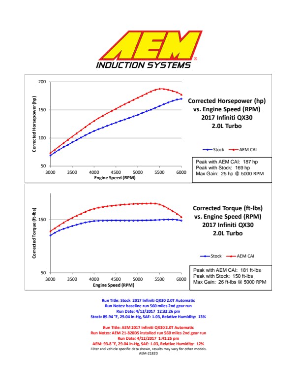 The AEM 21-820DS is an innovatively designed intake system to completely replace the restrictive air filter and airbox of some Infiniti QX30 models. The airbox has been crafted with premium materials and designed with 2 air scoops that feed from factory vent locations. It is aerodynamically engineered for better airflow, heat resistance, and improved aesthetics under the hood. The ECU is relocated underneath the airbox where a large vent keeps it cool. To clear the hood stand we incorporate a channel groove for a factory look on the air box. The AEM logo is showcased in a transparent badge, which also serves as a window to the filter so you know when it is time to have it serviced. The cylinder shaped AEM Dryflow air filter is made from an oil-free, synthetic filter media that can be used for up to 100,000 miles before cleaning is needed (depending on driving conditions).