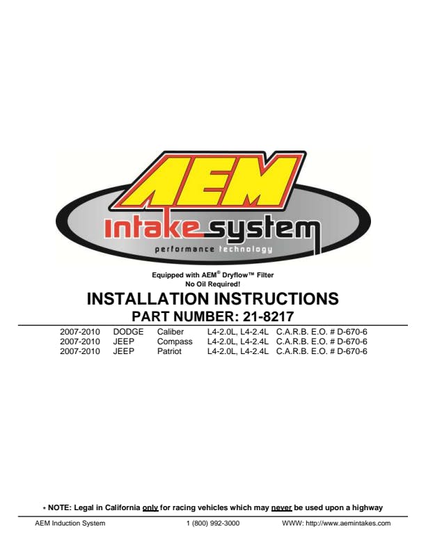 The AEM 21-8217DP Performance Cold Air Intake System produces horsepower and torque gains by replacing your vehicle's restrictive factory air filter and air intake housing. This air intake system was designed, tuned and dyno-tested to fit specific Dodge Caliber, Jeep Patriot and Compass models. Air enters the system through an oversized AEM Dryflow synthetic washable air filter for outstanding air flow, filtration and performance. The air filter is located in the original air box space which is designed to reduce intake air temperature and increase horsepower. The intake tubing is constructed from mandrel-bent aluminum featuring a durable chrome-like finish. This air intake system was developed to accommodate the engine's factory emissions control devices including the IAT sensor and crank case breather hose. The tapered cylinder shaped AEM Dryflow air filter is made from an oil-free, synthetic filter media that can be used for up to 100,000 miles before cleaning is needed (depending on driving conditions).