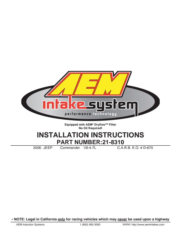 The AEM 21-8310DC Brute Force Air Intake System produces horsepower and torque gains by replacing the vehicle's restrictive factory air filter and air intake housing. This air intake system was designed, tuned and dyno-tested to fit specific Jeep Commander models. Air enters the system through an extra-large AEM Dryflow synthetic washable air filter for outstanding air flow, filtration and performance. The air filter is located in the original air box space and is protected by a heat shield which is designed to reduce intake air temperature and increase horsepower. The intake tubing is constructed from mandrel-bent aluminum featuring a durable gunmetal gray powder coated finish. This air intake system was developed to accommodate the engine's factory emissions control devices including the IAT sensor and crank case breather hose. The tapered cylinder shaped AEM Dryflow air filter is made from an oil-free, synthetic filter media that can be used for up to 100,000 miles before cleaning is needed (depending on driving conditions). The air intake system is easy to install with commonly available tools.