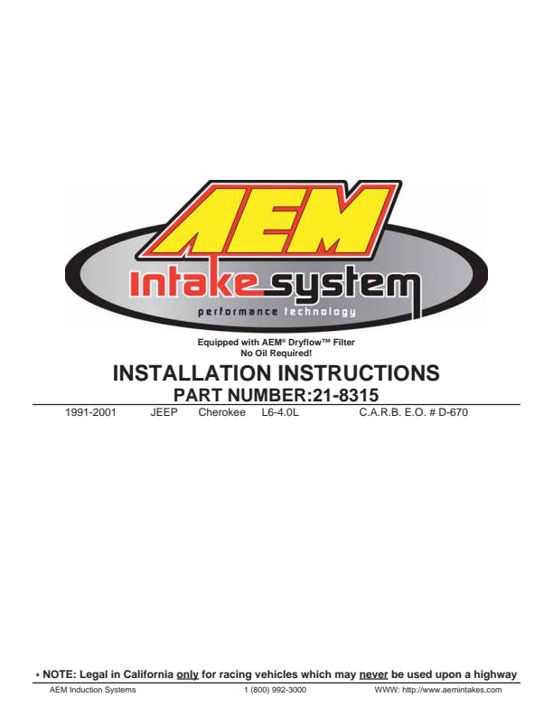 The AEM 21-8315DC Brute Force Air Intake System produces horsepower and torque gains by replacing the vehicle's restrictive factory air filter and air intake housing. This air intake system was designed, tuned and dyno-tested to fit specific Jeep Cherokee models. Air enters the system through an extra-large AEM Dryflow synthetic washable air filter for outstanding air flow, filtration and performance. The air filter is located in the original air box space and is protected by a heat shield which is designed to reduce intake air temperature and increase horsepower. The intake tubing is constructed from mandrel-bent aluminum featuring a durable gunmetal gray powder coated finish. This air intake system was developed to accommodate the engine's factory emissions control devices including the crankcase breather hose. The tapered cylinder shaped AEM Dryflow air filter is made from an oil-free, synthetic filter media that can be used for up to 100,000 miles before cleaning is needed (depending on driving conditions). The air intake system is easy to install with commonly available tools.