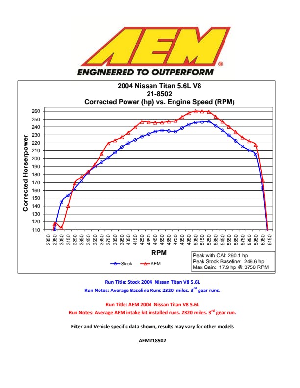 The AEM 21-8502DC Brute Force Air Intake System produces horsepower and torque gains for high displacement engines by replacing the vehicle's restrictive factory air filter and air intake housing. This air intake system was designed, tuned and dyno-tested to fit specific Nissan Titan, Armada and Pathfinder as well as Infiniti QX56 models. Air enters the system through an oversized AEM Dryflow synthetic washable air filter for outstanding air flow, filtration and performance. The air filter is located in the original air box space and is protected by a heat shield which is designed to reduce intake air temperature and increase horsepower. The intake tubing is constructed from mandrel-bent aluminum featuring a durable gunmetal gray powder coated finish. This air intake system was developed to accommodate the engine's factory emissions control devices including the mass air flow sensor and two replacement silicone breather hoses. The cylinder shaped AEM Dryflow air filter is made from an oil-free, synthetic filter media that can be used for up to 100,000 miles before cleaning is needed (depending on driving conditions).