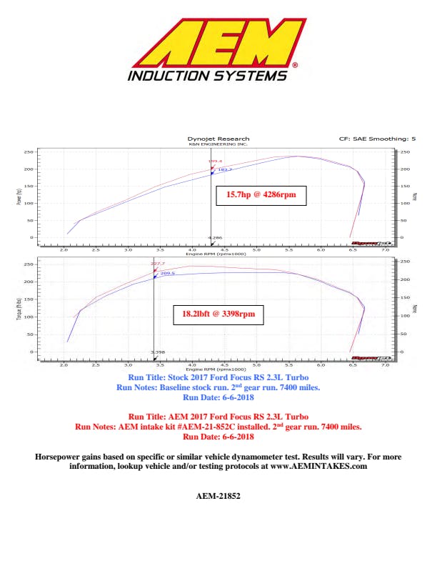 This Performance Air Intake System allows your engine to breath more air compared to the restrictive factory air intake housing. It is designed, tuned, and dyno-tested to produce more horsepower and torque. The cone-shaped AEM Dryflow air filter is made from an oil-free, synthetic filter media that can be used for up to 100,000 miles before cleaning is needed (depending on driving conditions). A custom shaped heat shield with edge trim lining is included to keep engine bay heat from the air intake. The air intake tube is constructed from mandrel-bent aluminum featuring a durable gunmetal gray powder coated finish.
