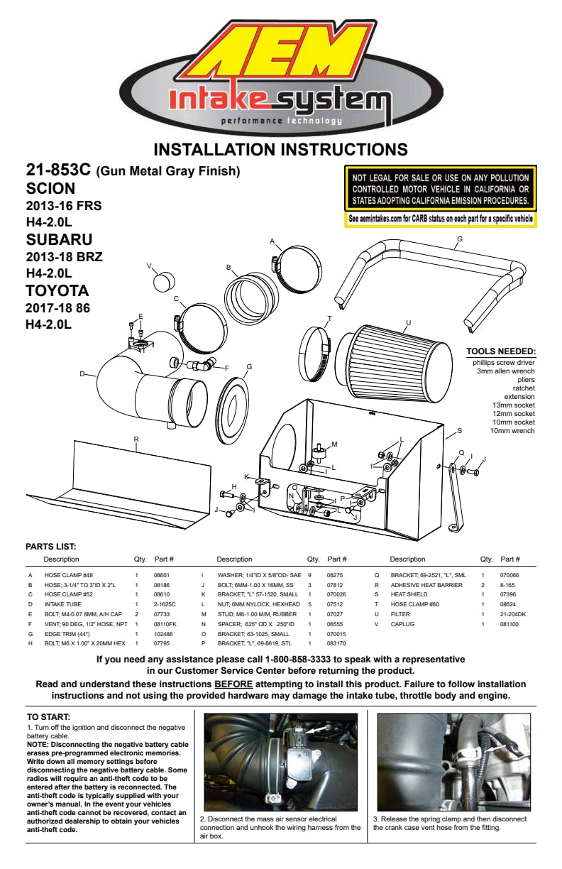 Not legal for sale or use in California on any pollution controlled motor vehicle. NOTE: Some specific models and years may be legal in CA. Check the CARB status on your parts at knfilters.com. |