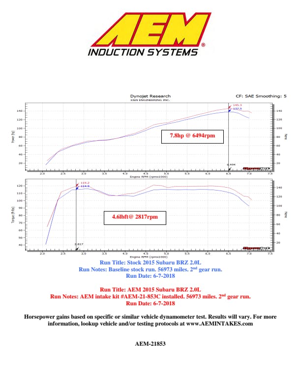 This Performance Air Intake System allows your engine to breath more air compared to the restrictive factory air intake housing. It is designed, tuned, and dyno-tested to produce more horsepower and torque. The cone-shaped AEM Dryflow air filter is made from an oil-free, synthetic filter media that can be used for up to 100,000 miles before cleaning is needed (depending on driving conditions). A custom shaped heat shield with edge trim lining is included to keep engine bay heat from the air intake. The air intake tube is constructed from mandrel-bent aluminum featuring a durable gunmetal gray powder coated finish.