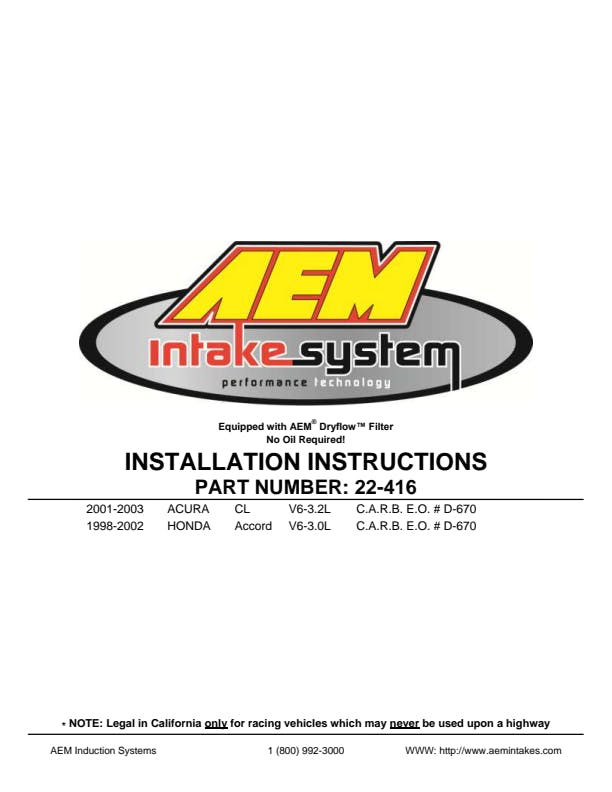 The AEM 22-416P Performance Short Ram Air Intake System has been engineered to be an affordable and easy way to boost the horsepower and torque of your engine. The restrictive factory air filter and air intake housing are replaced with this AEM air intake system which was designed, tuned and dyno-tested to fit specific Acura CL and Honda Accord models. Air enters the system through an oversized AEM Dryflow synthetic washable air filter for outstanding air flow, filtration and performance. The sound your engine makes when accelerating is also modified to a fuller, more aggressive resonance allowing you to hear and feel the horsepower upgrade. The intake tubing is constructed from mandrel-bent aluminum featuring a durable chrome-like finish. This air intake system was developed to accommodate the engine's factory emissions control devices including the engine breather hose and any vacuum lines. The tapered cylinder shaped AEM Dryflow air filter is made from an oil-free, synthetic filter media that can be used for up to 100,000 miles before cleaning is needed (depending on driving conditions). The air intake system is easy to install with commonly available tools and it is backed by AEM's Lifetime Limited Warranty. Some AEM air intakes are not legal for sale or use in California and other states adopting California emission standards, while others are 50 state legal. View the 22-416P vehicle applications to determine the legal status for each vehicle.