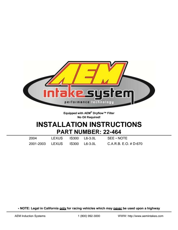 The AEM 22-464R Performance Short Ram Air Intake System has been engineered to be an affordable and easy way to boost the horsepower and torque of your engine. The restrictive factory air filter and air intake housing are replaced with this AEM air intake system which was designed, tuned and dyno-tested to fit specific Lexus IS300 models. Air enters the system through an oversized AEM Dryflow synthetic washable air filter for outstanding air flow, filtration and performance. The sound your engine makes when accelerating is also modified to a fuller, more aggressive resonance allowing you to hear and feel the horsepower upgrade. The intake tubing is constructed from mandrel-bent aluminum featuring a durable red powder coated finish. This air intake system was developed to accommodate the engine's factory emissions control devices including the mass airflow sensor, PCV hose and vacuum switching valve. The tapered cylinder shaped AEM Dryflow air filter is made from an oil-free, synthetic filter media that can be used for up to 100,000 miles before cleaning is needed (depending on driving conditions). The air intake system is easy to install with commonly available tools.