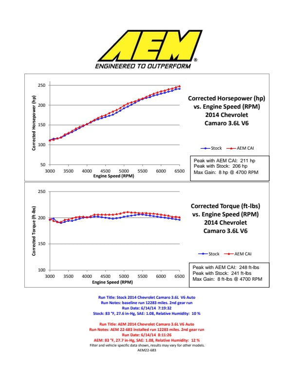 The AEM 22-683C Performance Air Intake System is a free-flowing, mandrel-bent aluminum tube air induction system designed to replace the restrictive factory air filter and air intake tubing while retaining the factory air box on some Chevrolet Camaro 3.6L V6 models. The air intake system comes with a replacement AEM high-flow air filter and a free-flowing aluminum intake tube that easily connects to your vehicle's factory air box and engine throttle body to dramatically increase air flow into your engine. With more air flowing through the custom-tuned intake tube you experience more horsepower and acceleration throughout the engine's RPM range. The intake tube is finished with an attractive and durable gunmetal gray powder-coat that provides a clean, high-performance look under the hood. The AEM Dryflow air filter is made from an oil-free, synthetic filter media that can be used for up to 100,000 miles before servicing is needed (depending on driving conditions). The air intake is designed for easy installation and simply requires one screwdriver to do the job.