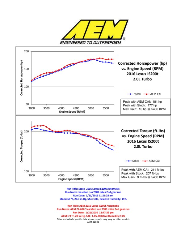 The AEM 22-692C Performance Air Intake System is a free-flowing, mandrel-bent aluminum tube air induction system designed to replace the restrictive factory air filter and air intake tubing while retaining the factory air box on select Lexus IS 200t models. The air intake system comes with a replacement AEM high-flow air filter and a free-flowing aluminum intake tube that easily connects to your vehicle's factory air box and engine throttle body to dramatically increase air flow into your engine. With more air flowing through the custom-tuned intake tube, you experience more horsepower and acceleration throughout the engine's RPM range. The air intake tube accodomates a breather hose and is finished with an attractive and durable gunmetal gray powder-coating that provides a clean, high-performance look under the hood. The AEM Dryflow air filter is made from an oil-free, synthetic filter media that can be used for up to 100,000 miles before servicing is needed (depending on driving conditions). This air intake is designed for easy installation and requires commonly available tools to do the job.