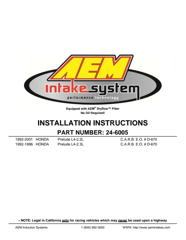 The AEM 24-6005C Dual Chamber Air Intake System is engineered to maximize horsepower and torque gains for specific Honda Prelude models by utilizing a patented dual chamber design. The restrictive factory air filter and air intake housing are replaced with this AEM dual chamber air intake system. Air enters the system through an oversized AEM Dryflow synthetic washable air filter for outstanding air flow, filtration and performance. The sound your engine makes when accelerating is also modified to a fuller, more aggressive resonance allowing you to hear and feel the horsepower upgrade. The intake tubing is constructed from mandrel-bent aluminum featuring a durable gunmetal gray powder coated finish. This air intake system was developed to accommodate the engine's factory emissions control devices including the engine breather hoses and water bypass hose. The tapered cylinder shaped AEM Dryflow air filter is made from an oil-free, synthetic filter media that can be used for up to 100,000 miles before cleaning is needed (depending on driving conditions).