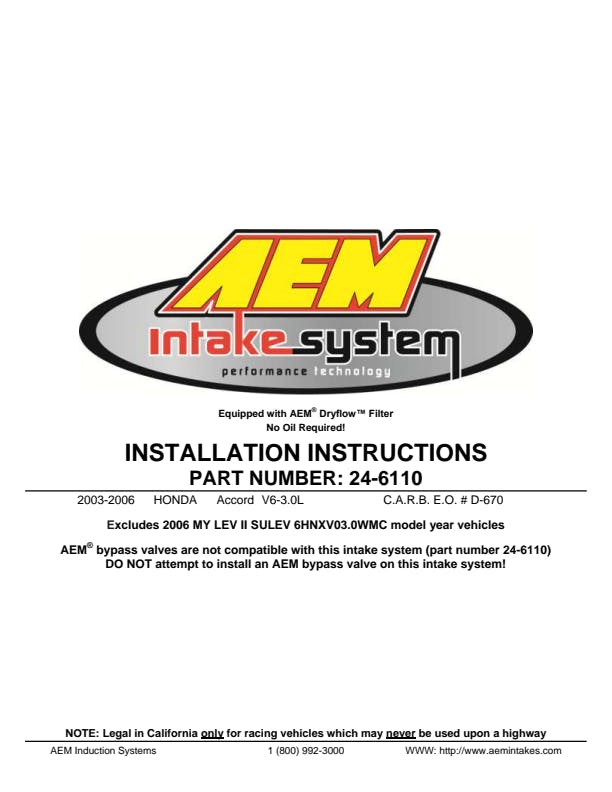 The AEM 24-6110C Dual Chamber Air Intake System is engineered to maximize horsepower and torque gains for specific Honda Accord models by utilizing a patented dual chamber design. The restrictive factory air filter and air intake housing are replaced with this AEM dual chamber air intake system. Air enters the system through an oversized AEM Dryflow synthetic washable air filter for outstanding air flow, filtration and performance. The sound your engine makes when accelerating is also modified to a fuller, more aggressive resonance allowing you to hear and feel the horsepower upgrade. The intake tubing is constructed from mandrel-bent aluminum featuring a durable gunmetal gray powder coated finish. This air intake system was developed to accommodate the engine's factory emissions control devices including the engine breather hose. The tapered cylinder shaped AEM Dryflow air filter is made from an oil-free, synthetic filter media that can be used for up to 100,000 miles before cleaning is needed (depending on driving conditions).