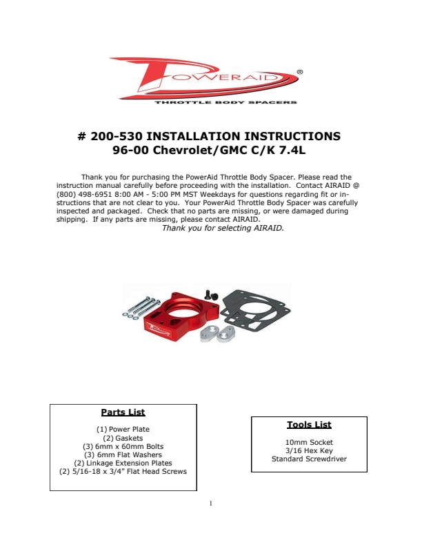 The AIRAID Throttle Body Spacer is designed to enhance mid-range torque using a patented Helix Bore which spins intake air going through the throttle body spacer. Includes mounting hardware.