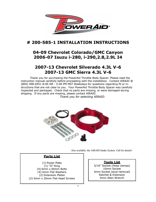 The AIRAID Throttle Body Spacer is designed to enhance mid-range torque using a patented Helix Bore which spins intake air going through the throttle body spacer. Includes mounting hardware.
