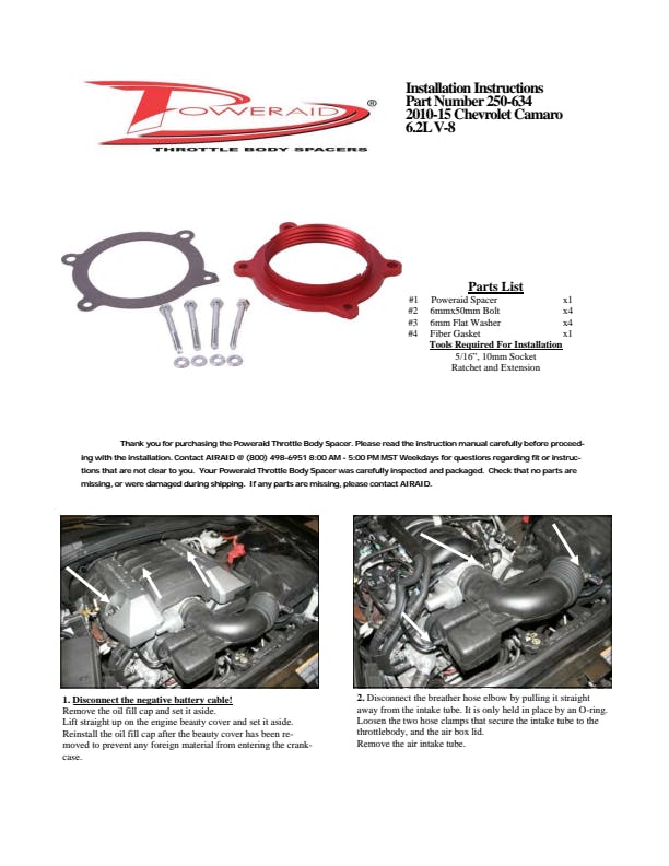 The AIRAID Throttle Body Spacer is designed to enhance mid-range torque using a patented Helix Bore which spins intake air going through the throttle body spacer. Includes mounting hardware.