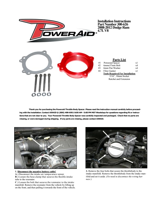The AIRAID Throttle Body Spacer is designed to enhance mid-range torque using a patented Helix Bore which spins intake air going through the throttle body spacer. Includes mounting hardware.
