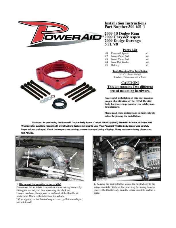 The AIRAID Throttle Body Spacer is designed to enhance mid-range torque using a patented Helix Bore which spins intake air going through the throttle body spacer. Includes mounting hardware.