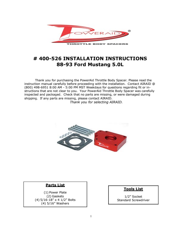 The AIRAID Throttle Body Spacer is designed to enhance mid-range torque using a patented Helix Bore which spins intake air going through the throttle body spacer. Includes mounting hardware.