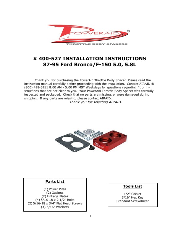 The AIRAID Throttle Body Spacer is designed to enhance mid-range torque using a patented Helix Bore which spins intake air going through the throttle body spacer. Includes mounting hardware.