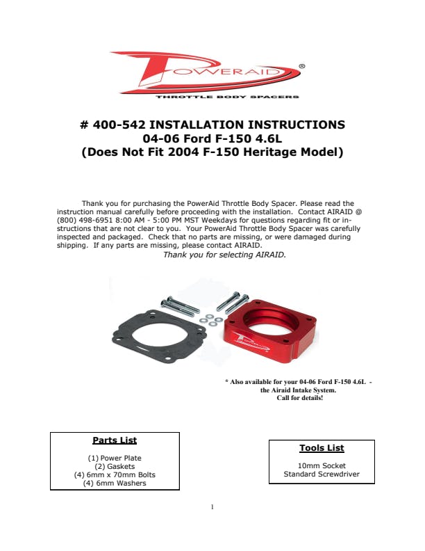 The AIRAID Throttle Body Spacer is designed to enhance mid-range torque using a patented Helix Bore which spins intake air going through the throttle body spacer. Includes mounting hardware.