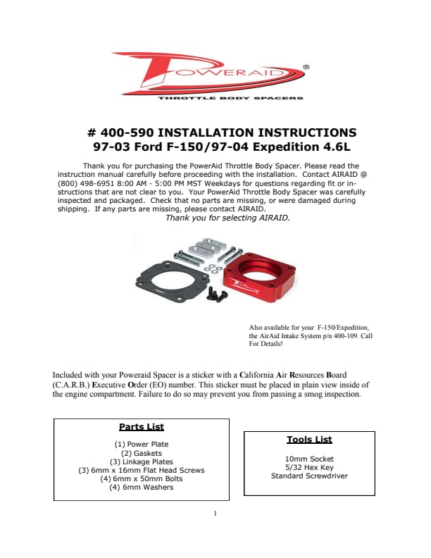The AIRAID Throttle Body Spacer is designed to enhance mid-range torque using a patented Helix Bore which spins intake air going through the throttle body spacer. Includes mounting hardware.