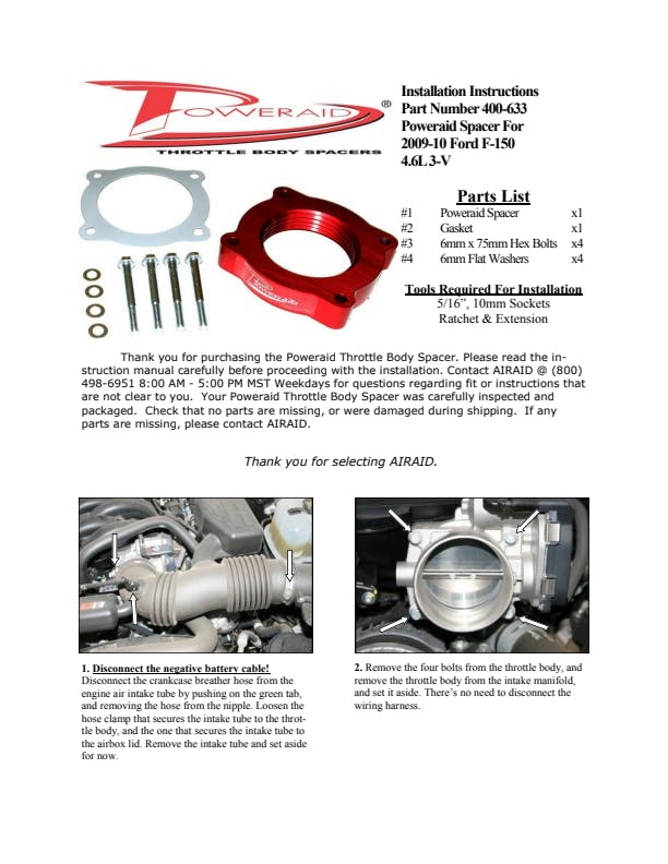 The AIRAID Throttle Body Spacer is designed to enhance mid-range torque using a patented Helix Bore which spins intake air going through the throttle body spacer. Includes mounting hardware.