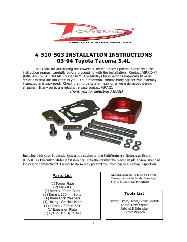 The AIRAID Throttle Body Spacer is designed to enhance mid-range torque using a patented Helix Bore which spins intake air going through the throttle body spacer. Includes mounting hardware.
