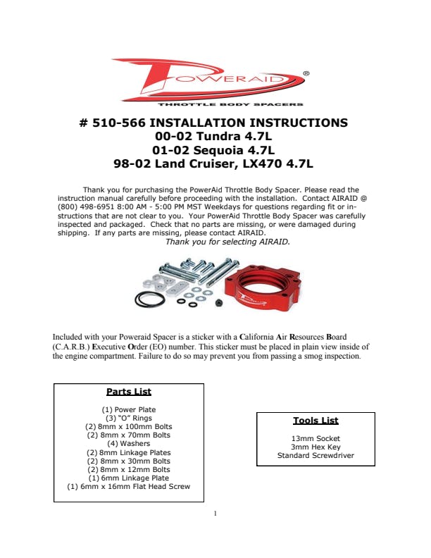 The AIRAID Throttle Body Spacer is designed to enhance mid-range torque using a patented Helix Bore which spins intake air going through the throttle body spacer. Includes mounting hardware.
