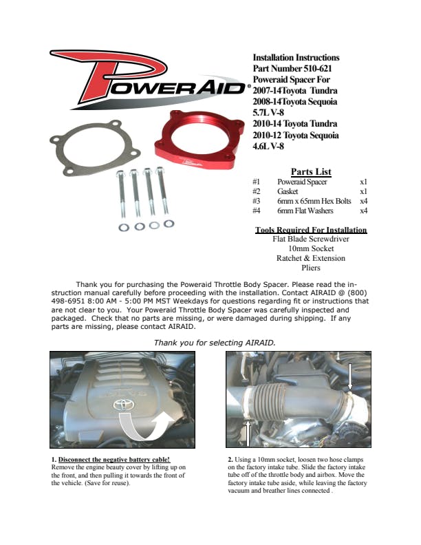 The AIRAID Throttle Body Spacer is designed to enhance mid-range torque using a patented Helix Bore which spins intake air going through the throttle body spacer. Includes mounting hardware.