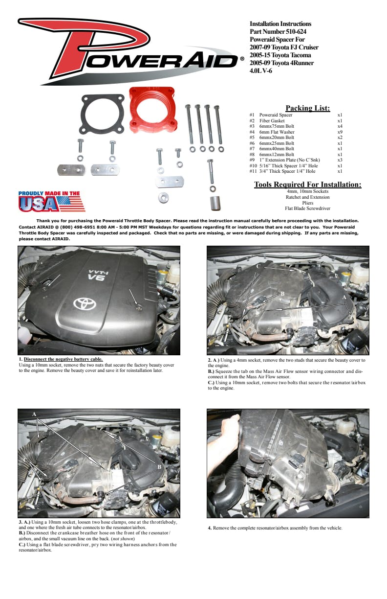 The AIRAID Throttle Body Spacer is designed to enhance mid-range torque using a patented Helix Bore which spins intake air going through the throttle body spacer. Includes mounting hardware.