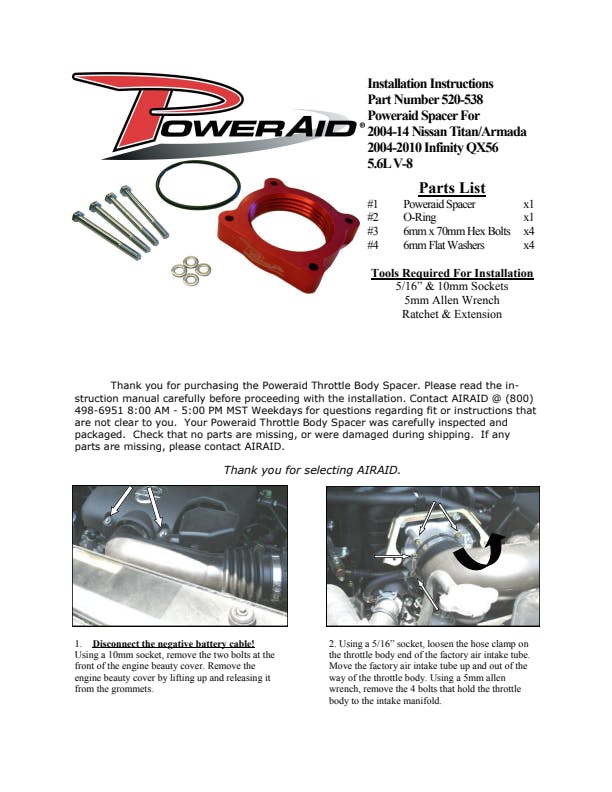 The AIRAID Throttle Body Spacer is designed to enhance mid-range torque using a patented Helix Bore which spins intake air going through the throttle body spacer. Includes mounting hardware.