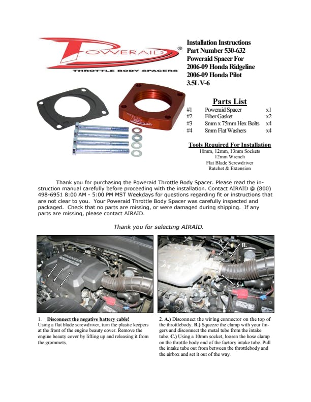 The AIRAID Throttle Body Spacer is designed to enhance mid-range torque using a patented Helix Bore which spins intake air going through the throttle body spacer. Includes mounting hardware.