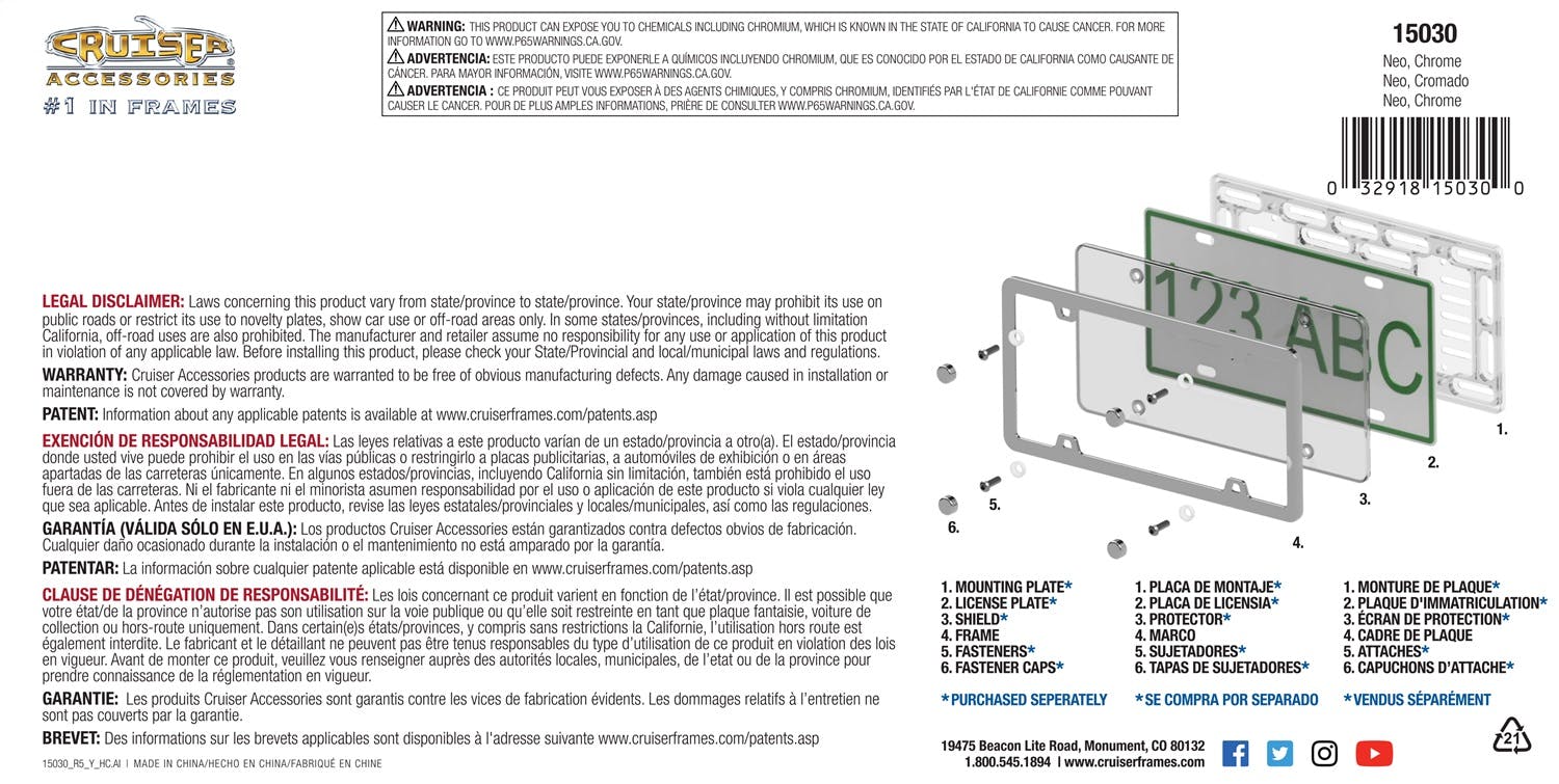 This Neo License Plate Frame (Chrome) adds style and class to any vehicle or license plate. It is also an Engineered To Show More Plate product, which means it displays more license plate surface area than a standard license plate frame. It features a hand-polished finish, a durable die-cast metal frame, and extra-heavy "show chrome" that polishes off any look. Installation is easy with step-by-step instructions included. Mounting plates, shields, and novelty plates are sold separately.