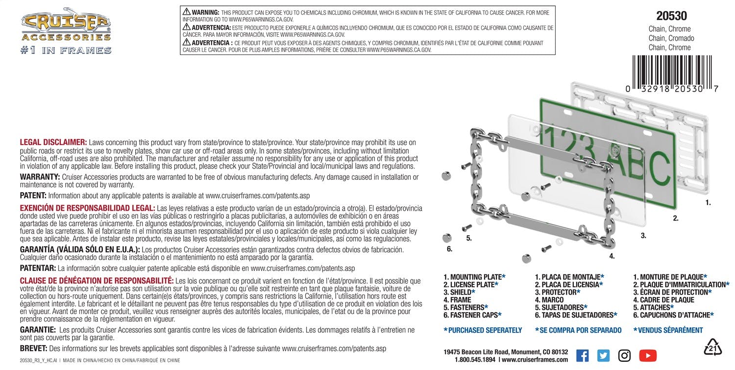 This Chain License Plate Frame (Chrome) adds style and class to any vehicle or license plate. It is also an Engineered To Show More Plate product, which means it displays more license plate surface area than a standard license plate frame. It features an original classic chain link design, a zinc die-cast metal construction, extra-heavy "show chrome" plating, and a hand-polished finish. Installation is easy with step-by-step instructions included. Mounting plates, shields, and novelty plates are sold separately.