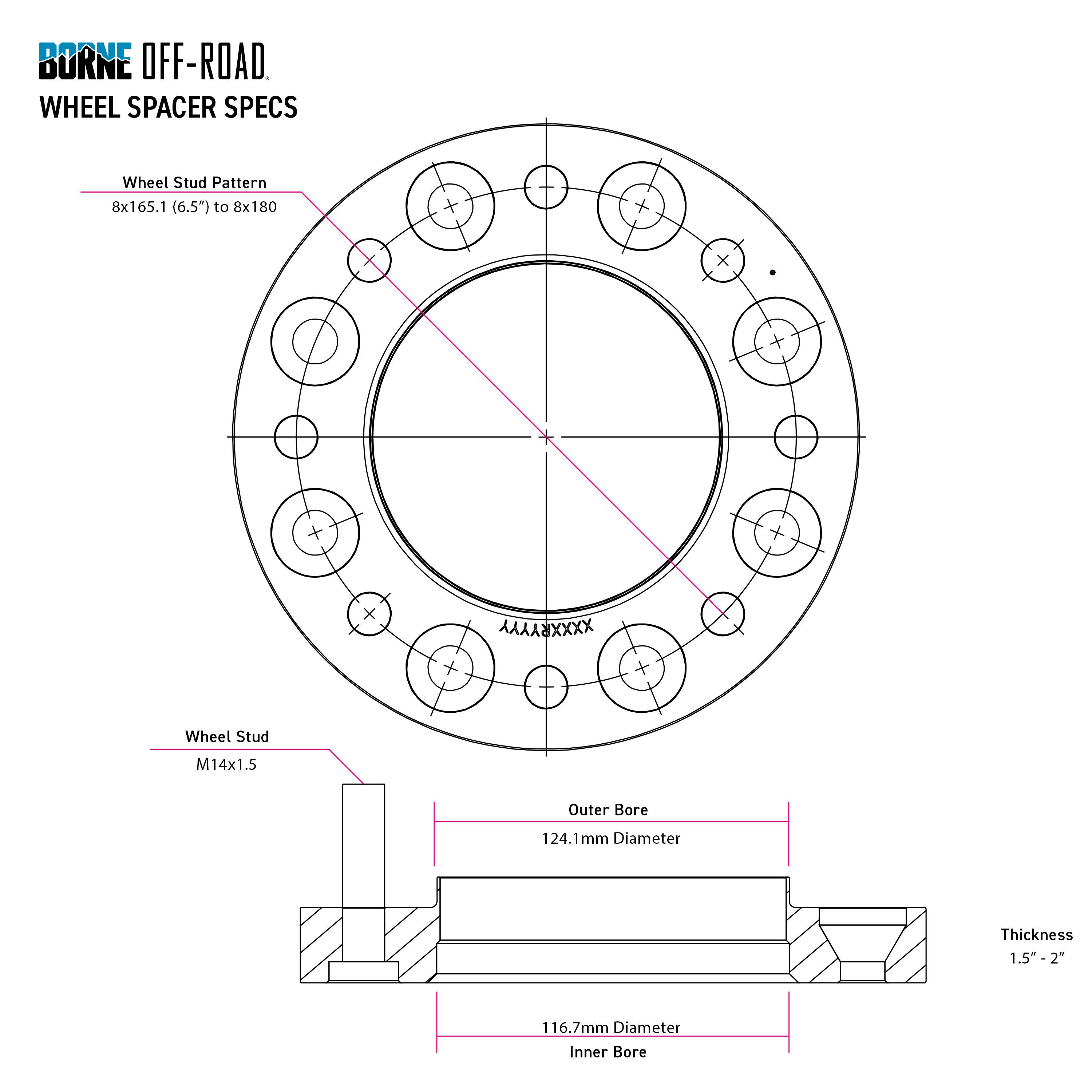 Borne Off-Road wheel spacers feature a black anodized finish to ensure protection against corrosion. Each kit contains two wheel spacers with pre-installed studs and all hardware necessary for installation. As with all our products, this wheel spacer kit includes our signature Lifetime Warranty.