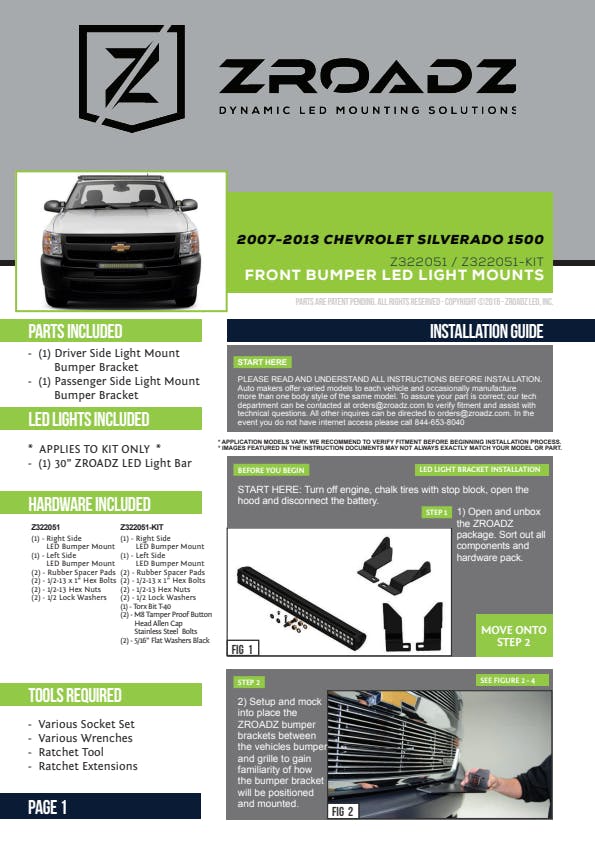 ZROADZ Front Bumper LED Mounts and kits are a quick and easy way to add forward facing lighting to your vehicle. The simple bolt on installation uses factory bolt locations and provides significant auxiliary lighting. Typical installation time is under 30 minutes and can be successfully installed using common hand tools by even the most casual enthusiast. ZROADZ Front Bumper LED Mounts are available in complete kits with light and wiring harness, or as brackets only for mounting common and popular LED light bars. ZROADZ Front Bumper LED Mounts are designed and made in USA.