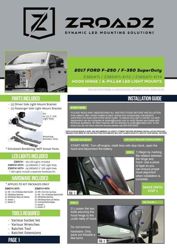 ZROADZ Hood Hinge LED Mounts, commonly known as ditch light brackets, and kits are one of the easiest upgrades to add auxiliary lighting to a vehicle. The small low profile package adds functional utility and the mounting brackets are a simple, no drill, bolt on installation utilizing the factory hood attachment points to mount to the vehicle. Simply loosen the factory hood bolts, slide the ZROADZ bracket into place and re-tighten the bolts. These versatile kits are ideal for lighting the trail, or a work area. ZROADZ Hood Hinge bracket mounts are designed and manufactured in USA.