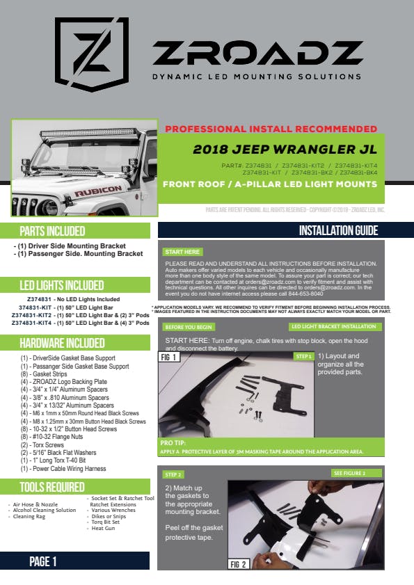 ZROADZ Jeep Wrangler Roof LED Mounts are the most robust roof mount light brackets on the market. Manufactured from laser cut 1/8" mild steel, and formed on engineered metal stamping dies. This industry exclusive design allows the roof brackets to contour to the A-Pillar of your Jeep and provide a clean appearance when installed. ZROADZ roof brackets and kits feature heavy duty solid rubber gasket for a secure and vibration free installation. ZROADZ Roof LED Mounts are available in complete kits with light and wiring harness, or as brackets only for mounting common and popular LED light bars. ZROADZ Front Roof LED Mounts are designed and made in USA.
